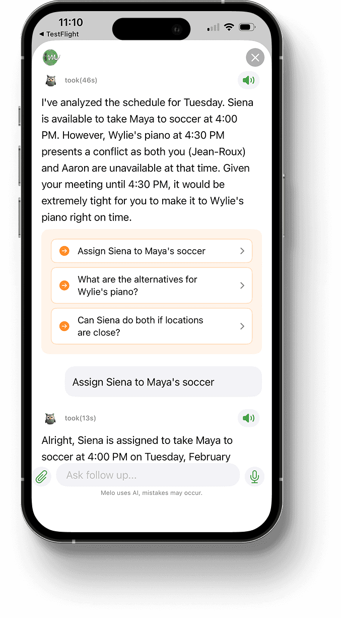 MeLo works best when it knows your world—but you're always in control of what you share. The more context MeLo has, the more helpful it becomes. For example: Dietary preferences → MeLo plans weeknight dinners and school lunches your family will actually eat Kids' interests → MeLo suggests birthday party ideas they'll love, not generic Pinterest boards Work location and schedule → MeLo calculates when you need to leave to get kids from school to soccer on time Your support network → MeLo knows who to delegate tasks to (partner, nanny, parents) and how to communicate with them You only share what feels comfortable. Skip the dietary preferences? No problem—MeLo will still help with planning, just with fewer personalized suggestions. The key benefit: the information you provide eliminates the thinking and decision-making that drains you daily. MeLo uses your information solely to reduce your mental load—never to sell, never to spam. It's like having a trusted assistant who actually knows your life, so you don't have to explain everything from scratch every single time.