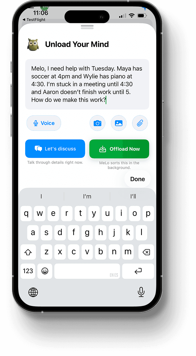 MentalLoad is the app. MeLo is your AI companion that lives inside it. Think of MentalLoad as the platform and MeLo (the owl) as your always-available partner who makes everything work. Feeling overwhelmed? Tap MeLo. Need to offload a task? Talk to MeLo. Can't remember if someone booked the dentist? Ask MeLo. MeLo is the one who listens, learns, delegates, and follows through—so you can finally stop carrying everything in your head. The owl isn't just a mascot; it's the AI doing the actual work to lighten your load.