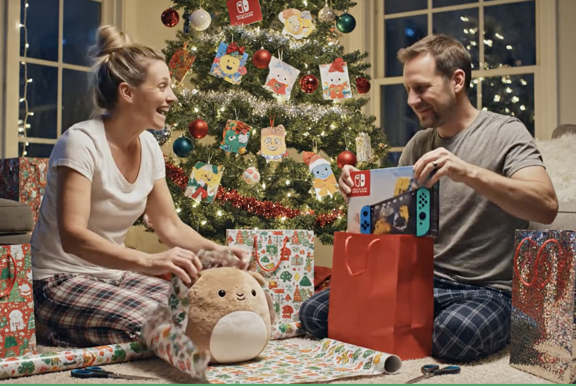 A man and woman are opening Christmas presents in front of a decorated Christmas tree. The woman is holding a plush toy, and the man is holding a Nintendo Switch console with two controllers, sitting on the floor with wrapped gifts around them.