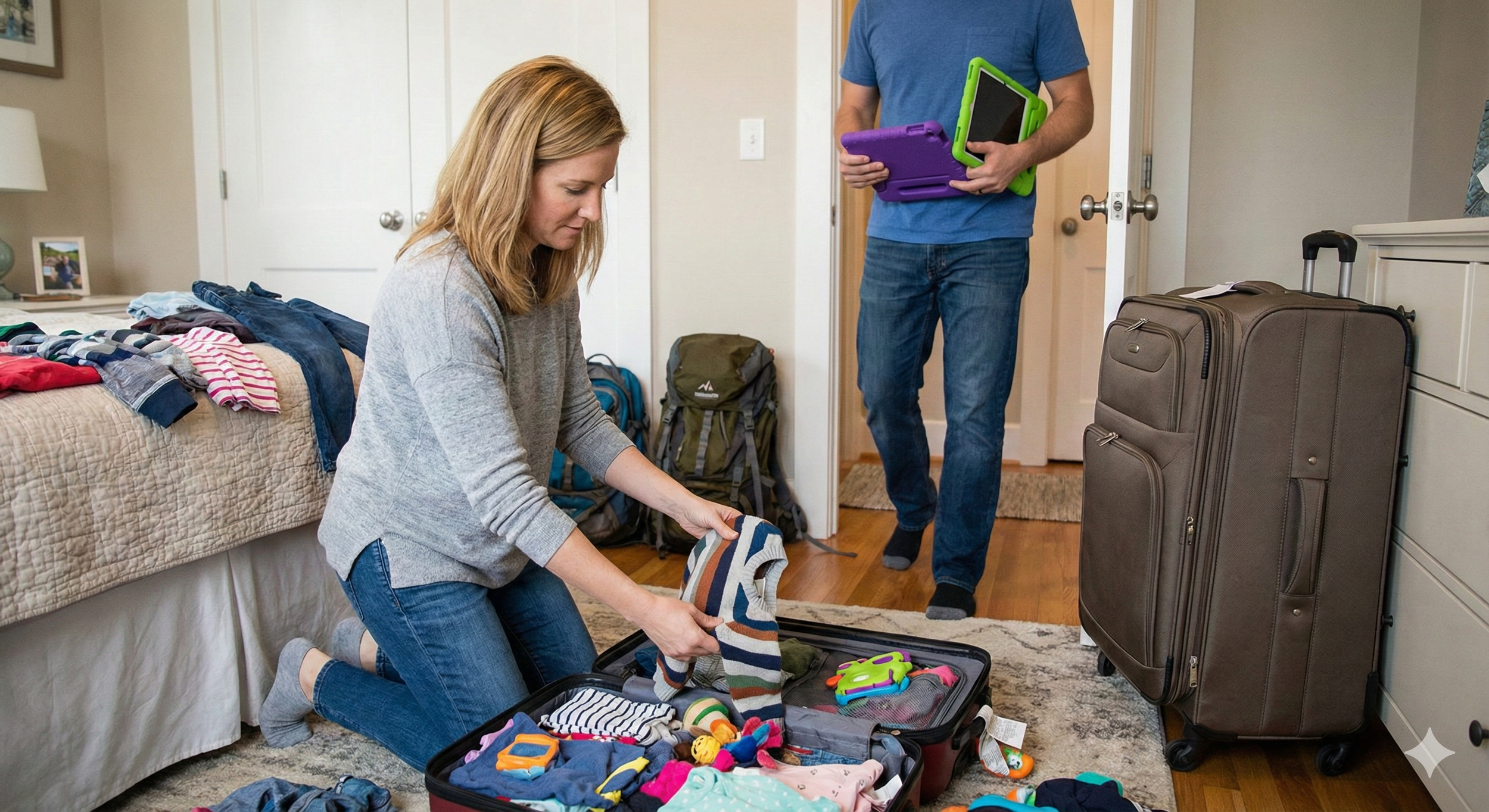A woman sitting on the floor packing a suitcase with clothes and toys, while a man standing nearby holding electronic devices.