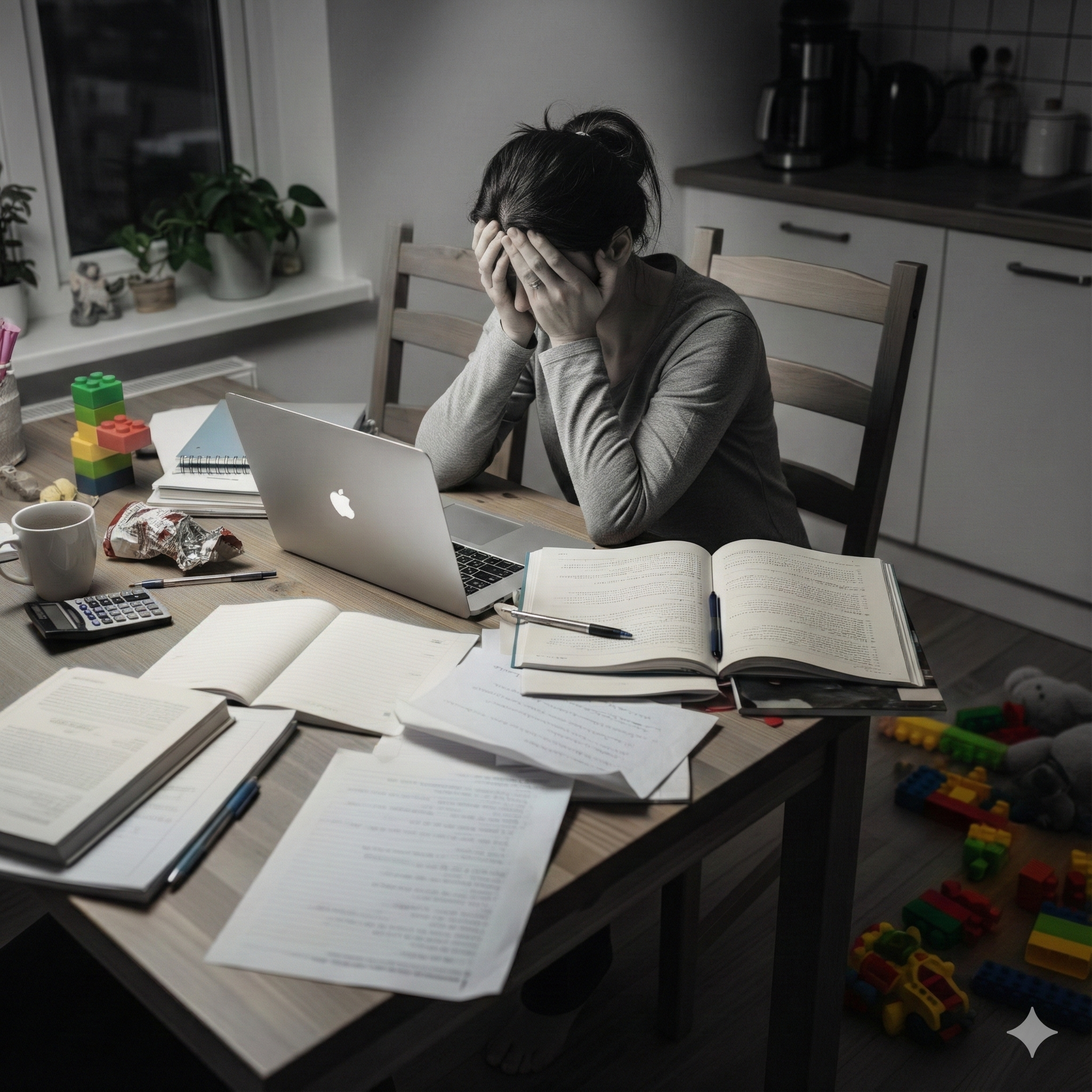 A woman sitting at a cluttered table with her hands covering her face, surrounded by open books, papers, a laptop, and office supplies in a dimly lit room.